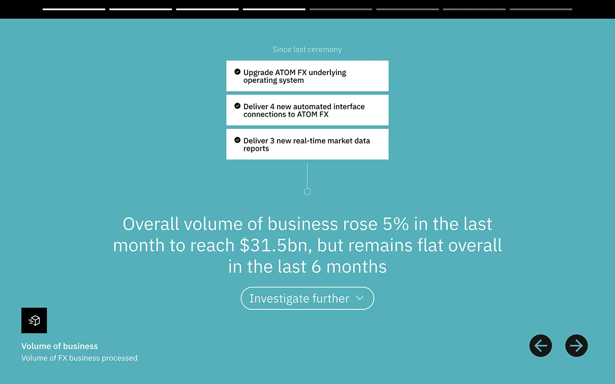 Design of an interactive report for a major bank, engineered to make performance indicators legible and actionable for teams on a daily basis.